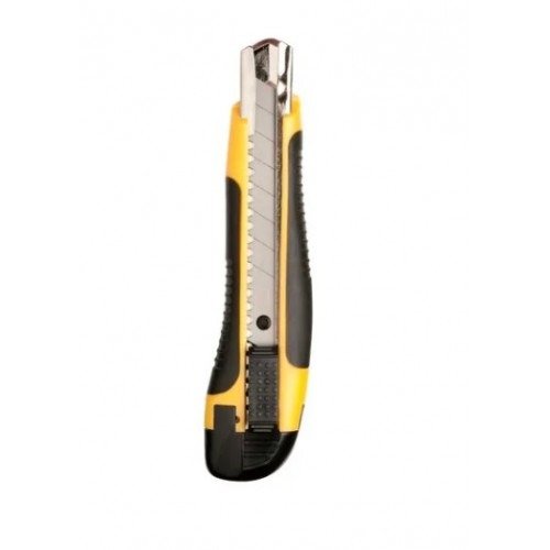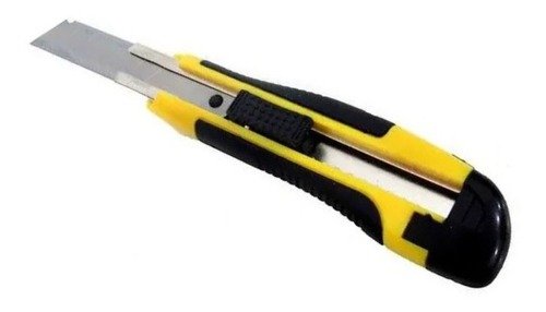 Largura da lâmina: 18 mm Quantidade de lâminas de reposição: 1 Materiais do punho: Borracha Capacidade de armazenamento de lâminas: 1 Descrição Estilete Profissional Emborrachado Com Trava 18mm Características: - Estilete emborrachado - Corpo emborrachado - Com trava automática - Profissional - Lâminas de 18mm - Com quebrador