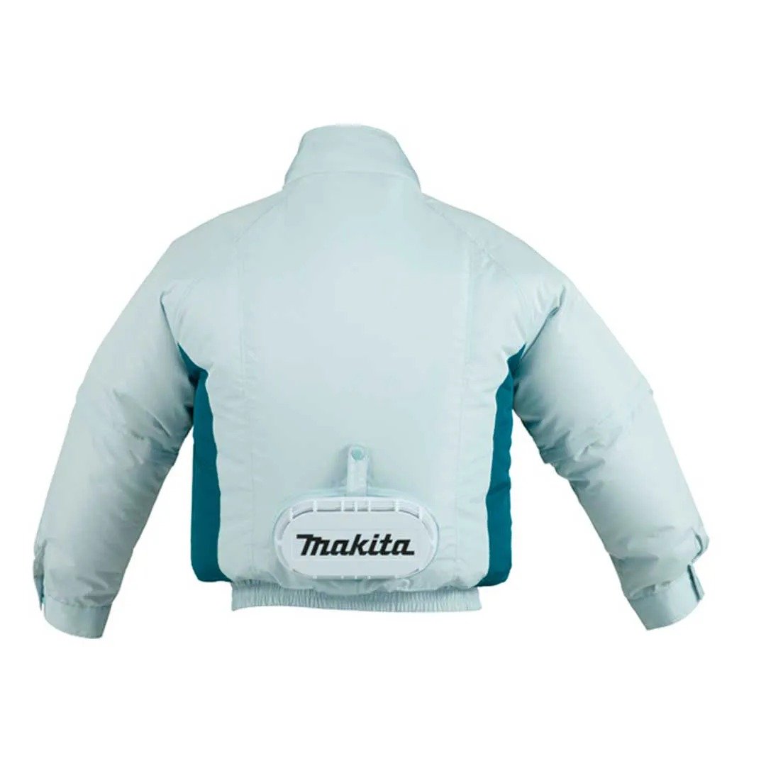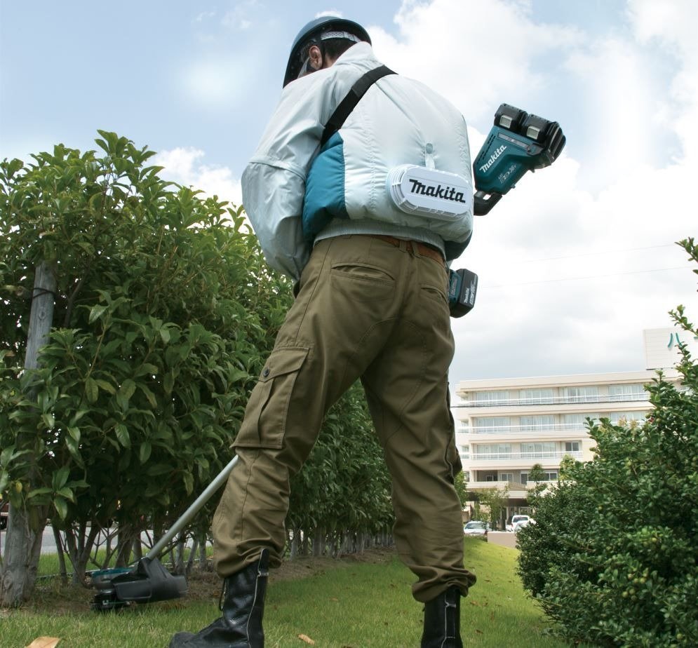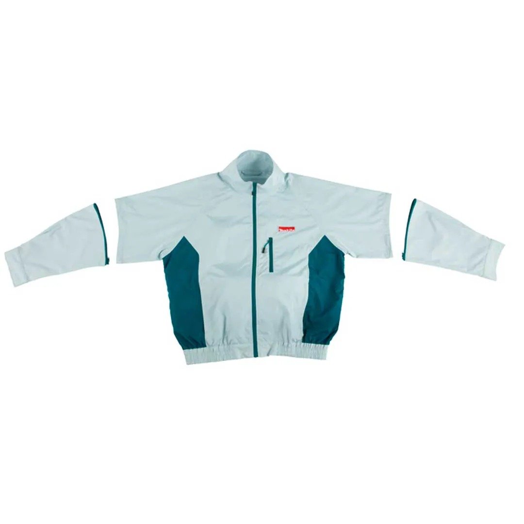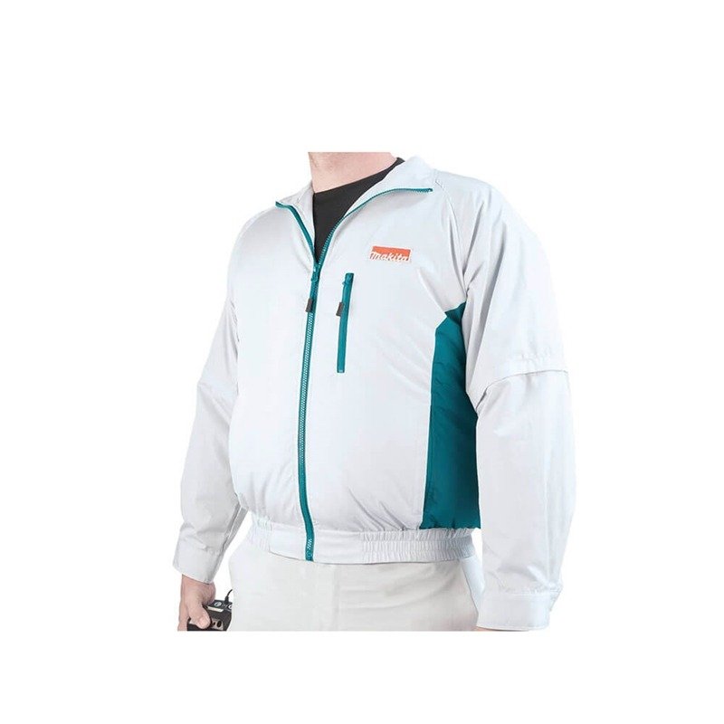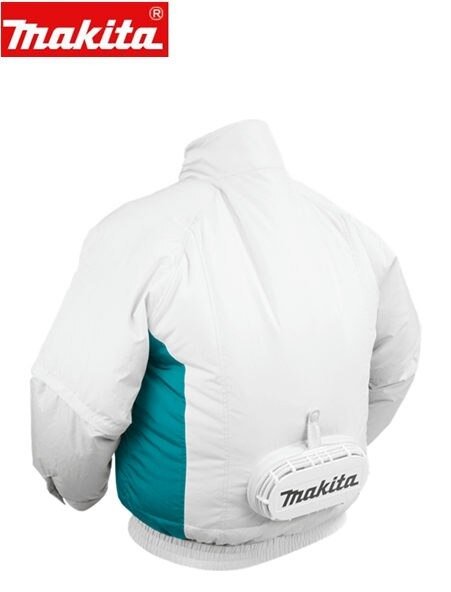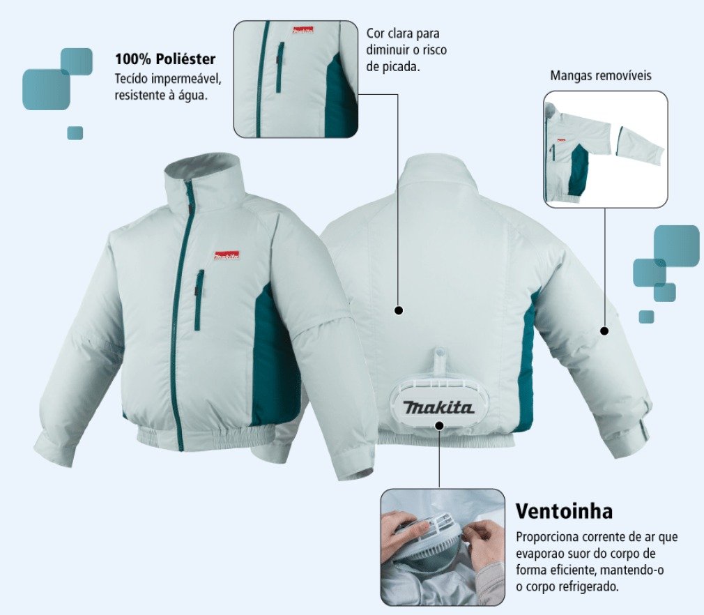 Não Acompanha Bateria Jaqueta refrigerada à bateria Ideal para trabalhar em locais quentes Tecido 100% poliéster, impermeável, resistente à água Mangas removíveis Ventoinha que proporciona corrente de ar que faz evaporar o suor do corpo de forma eficiente, mantendo o corpo refrigerado Máxima proteção contra o calor e os mosquitos Proteção contra exposição ao sol Maior ventilação em ambientes quentes Proteção contra picada de insetos Evita a transpiração, que atrai mosquitos Cor clara para diminuir o risco da picada Fixador para baterias Compatível com as baterias de 18V e 14,4V Gancho para pendurar a bateria de forma segura no cinto Entrada USB para carregar celulares, smartphones e outros dispositivos móveis * Não acompanha bateria e carregador Efeitos do resfriamento Comparação do resfriamento de temperatura do corpo durante o trabalho: Temperatura da pele mantém-se resfriada nas mesmas condições de trabalho. Características Modelo: DFJ201Z Marca: Makita Material: Poliéster Tamanho: G Capacidade 18V E 14,4V Volume de Ar 1.4m³/min Características Tempo de uso com bateria 18V 5.0 Ah: Alta: 12h Média: 21h Baixa: 29h Ideal Para Trabalhar em locais quentes mantendo a temperatura corporal estável. Peso 0,66 Kg Itens que Acompanham * Não acompanham bateria e carregador. Este produto é recomendado para quem já possui ferramenta a bateria 18V LXT. Garantia direto com o Fabricante 1 Ano (12 meses) *Imagem meramente Ilustrativa *As Informações são de total Responsabilidade/Fornecidas pelo Fabricante